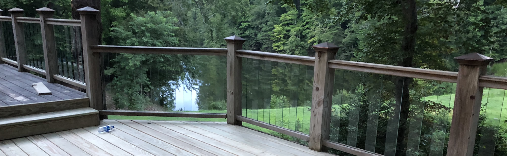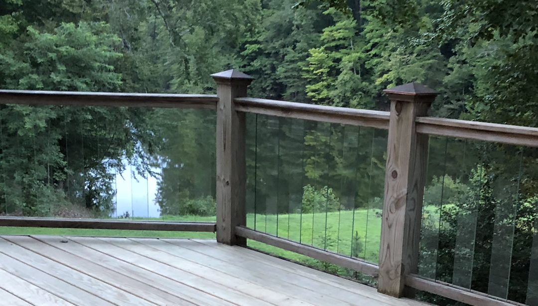 Wood deck with wood post over looking a lake