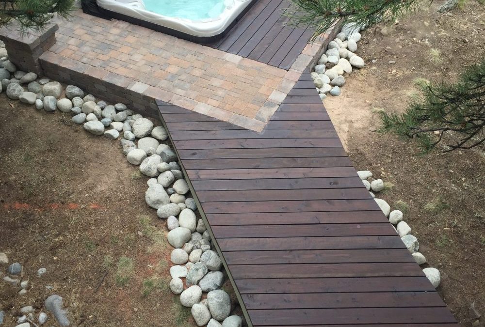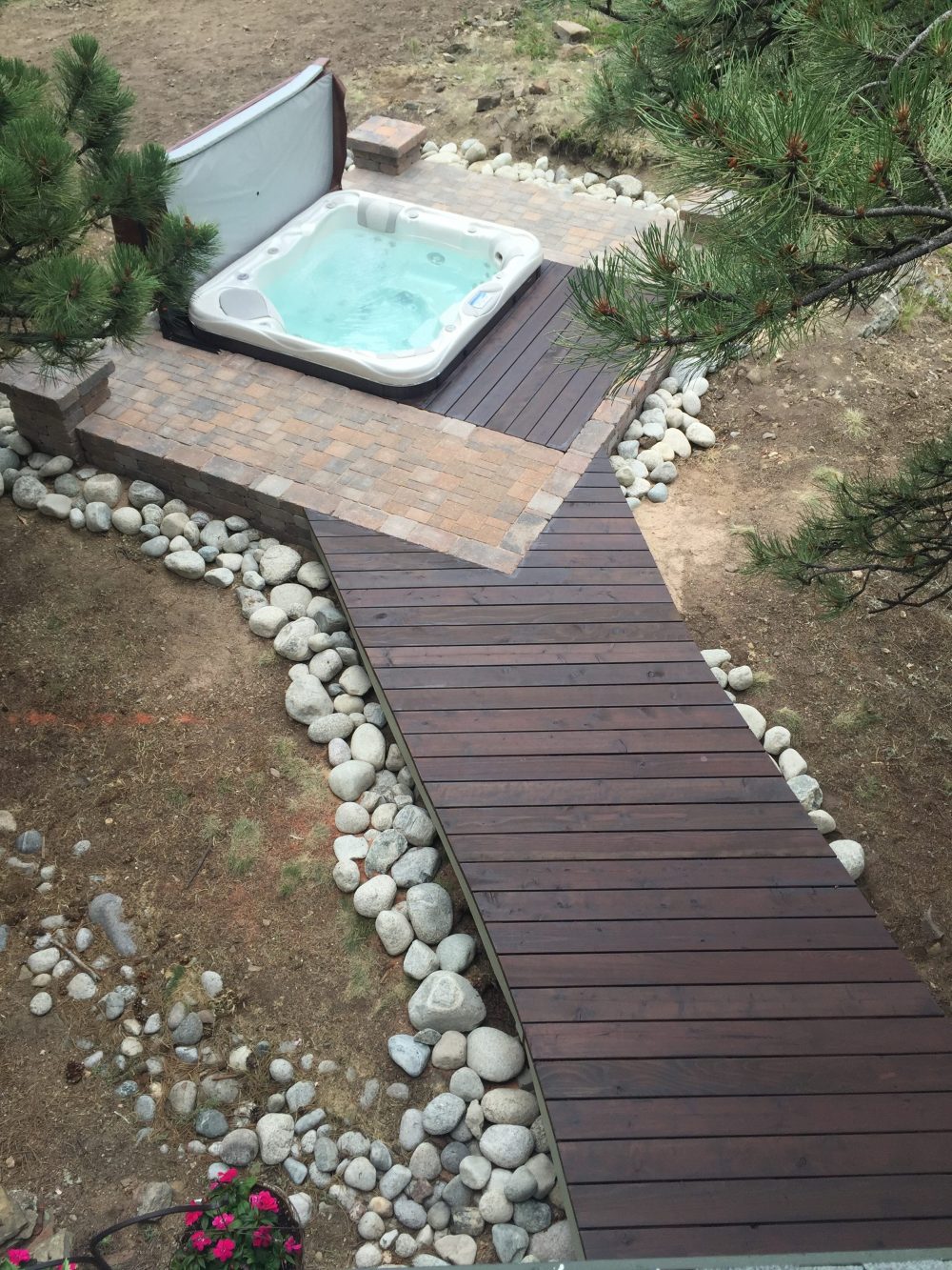 IMG_2860 A wooden walkway leading to pavers, and wood deck, and hot tub